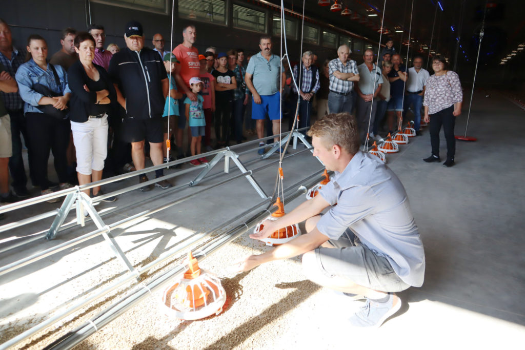 Juniorlandwirt Michael Heuberger erläuterte eingangs den Betrieb, der mit Milchvieh und Legehennen seit 2011 als Biobetrieb geführt wird. Am Eierhäusl beim Hof kann man sich Bio-Eier, Tee und Gewürze sowie Nudeln, verarbeitet aus den eigenen Eiern, rund um die Uhr kaufen. Nun arbeite man nach den Naturlandrichtlinien, eine Vorraussetzung mit dem Vertragspartner “Hubers Landhendl” aus Österreich. Die Familie zeigte anschließend den in den vergangenen Monaten entstandenen Maststall für Biohähnchen. Diese werden lebend am Schlachttag nach Österreich gebracht und finden anschließend Eingang in Süddeutschlands Supermärkten wie Rewe, EDEKA, Lidl oder Aldi.