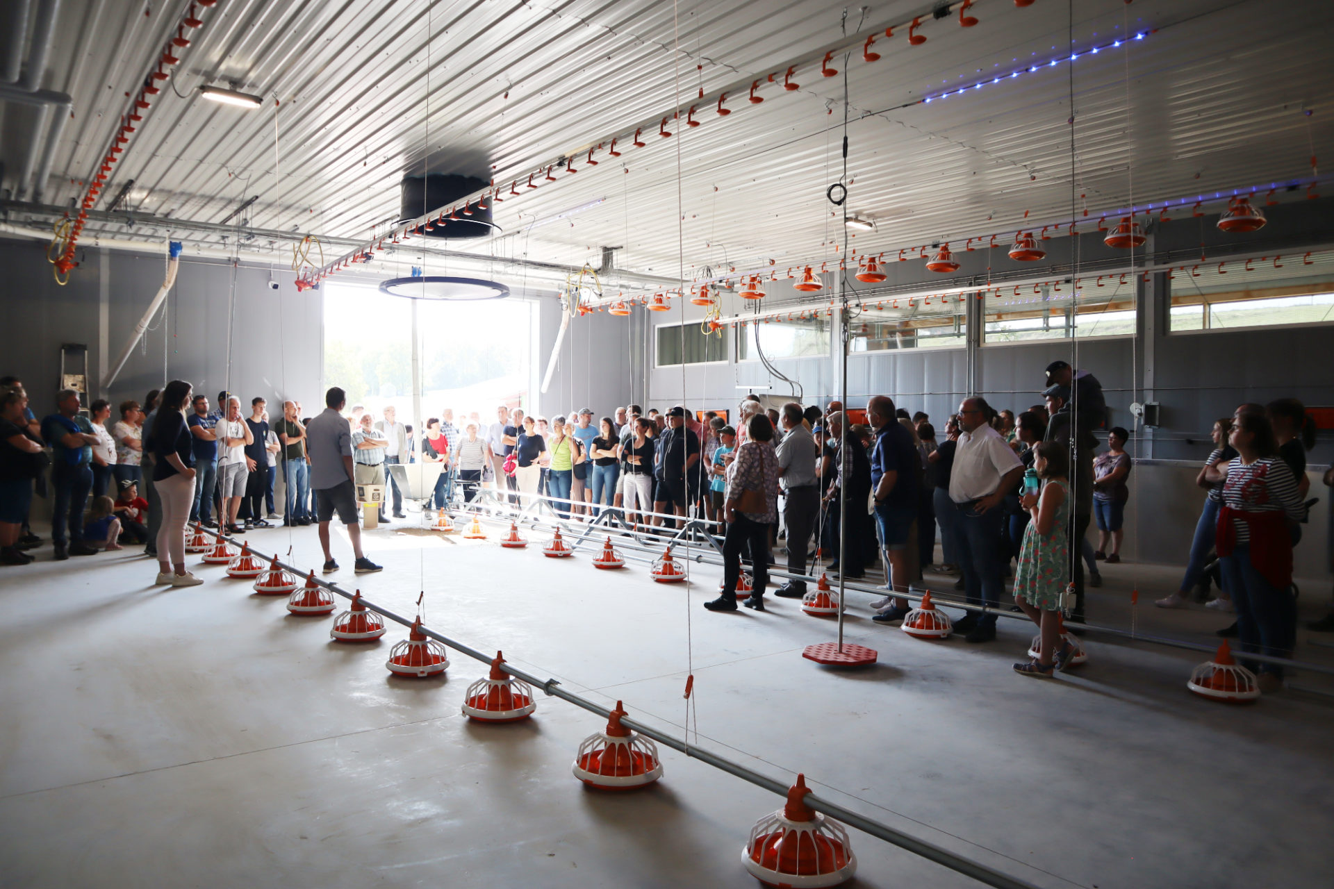 Juniorlandwirt Michael Heuberger erläuterte eingangs den Betrieb, der mit Milchvieh und Legehennen seit 2011 als Biobetrieb geführt wird. Am Eierhäusl beim Hof kann man sich Bio-Eier, Tee und Gewürze sowie Nudeln, verarbeitet aus den eigenen Eiern, rund um die Uhr kaufen. Nun arbeite man nach den Naturlandrichtlinien, eine Vorraussetzung mit dem Vertragspartner “Hubers Landhendl” aus Österreich. Die Familie zeigte anschließend den in den vergangenen Monaten entstandenen Maststall für Biohähnchen. Diese werden lebend am Schlachttag nach Österreich gebracht und finden anschließend Eingang in Süddeutschlands Supermärkten wie Rewe, EDEKA, Lidl oder Aldi.
